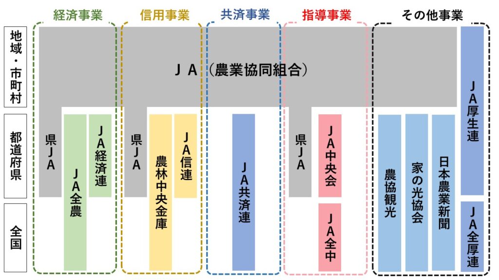 例えば、経済事業はJA全農や経済連、信用事業は農林中金やJA信連、共済事業はJA共済連が管轄しています。